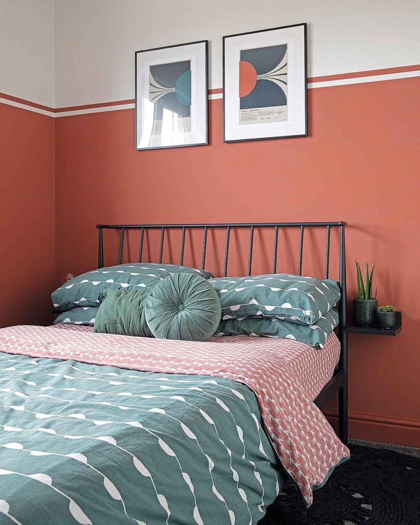 The warm terracotta wall color provides an inviting backdrop, complemented by cool-toned geometric bedding. Contemporary art pieces reflect the shapes of the bedding, creating a cohesive theme. A simple metal bed frame adds an industrial edge, and greenery on the nightstand brings a touch of nature indoors.