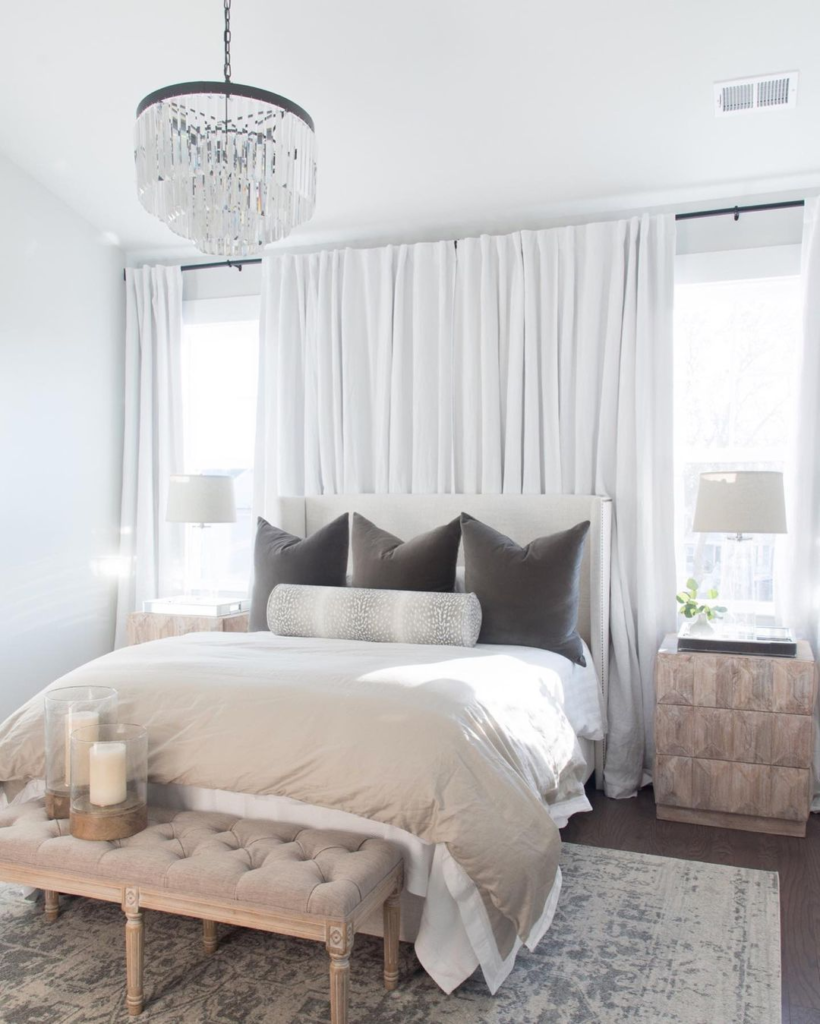 Floor-to-ceiling curtains gracefully frame the bed, enhancing the room’s height and elegance. A crystal chandelier casts a soft, glamorous glow. Neutral tones and plush textiles create a luxurious, calming environment. The tufted bench and textured nightstand introduce sophisticated, tactile elements to this serene retreat.