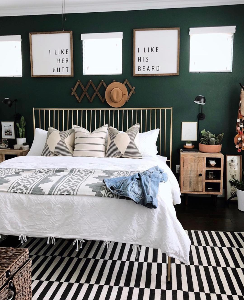 A deep green wall anchors the space, accentuated by whimsical framed quotes. The golden bed frame adds a mid-century modern touch, while striped pillows and a patterned throw blend effortlessly with a bold, striped floor rug. Vintage and rustic decor pieces infuse the room with playful nostalgia.
