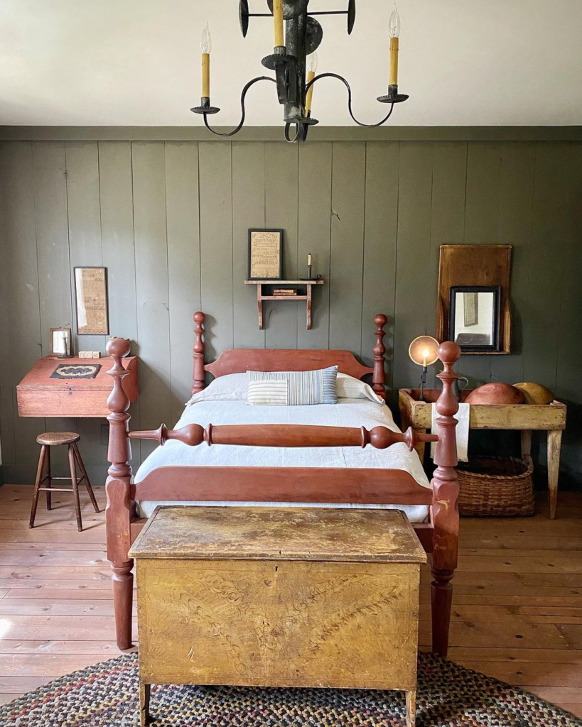 A classic four-poster bed anchors the room with its rich wooden tones, while antique furnishings evoke a sense of history. Olive-green paneling and traditional braided rugs reinforce the rustic theme. Candle-style chandeliers and vintage mirrors complete the room’s nostalgic charm.