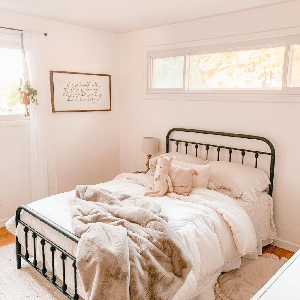A vintage metal bed frame adds timeless appeal against soft pastel walls. Fluffy bedding and a plush throw create a comfortable haven, while a framed quote on the wall offers inspiration. The simple, homely decor and natural light craft a tranquil and inviting bedroom retreat.