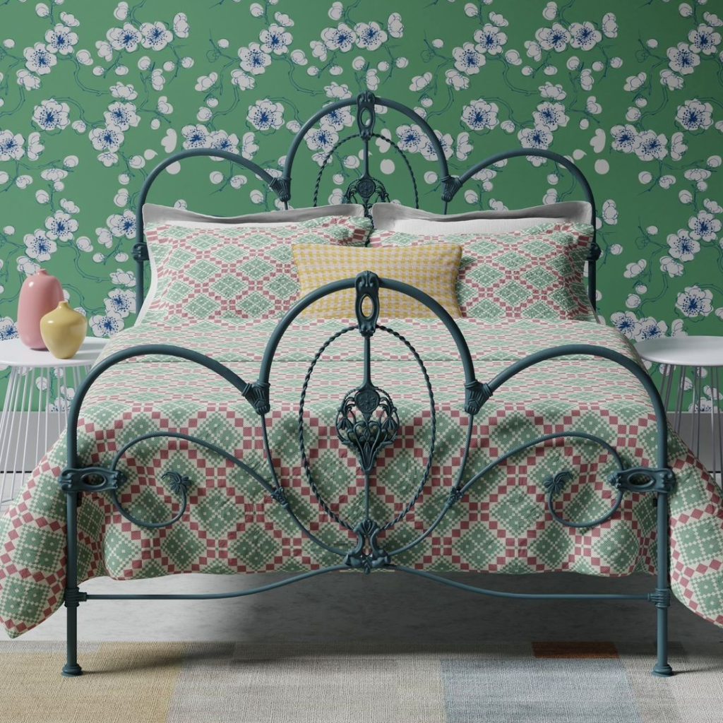 An ornate iron bed frame provides a historic feel, set against lively floral wallpaper. Patterned bedding adds country charm, blending with the room’s antique vibe. The symmetry of the bed frame complements the wallpaper’s rhythm, while a whimsical bedside table and colorful accents introduce a playful element.