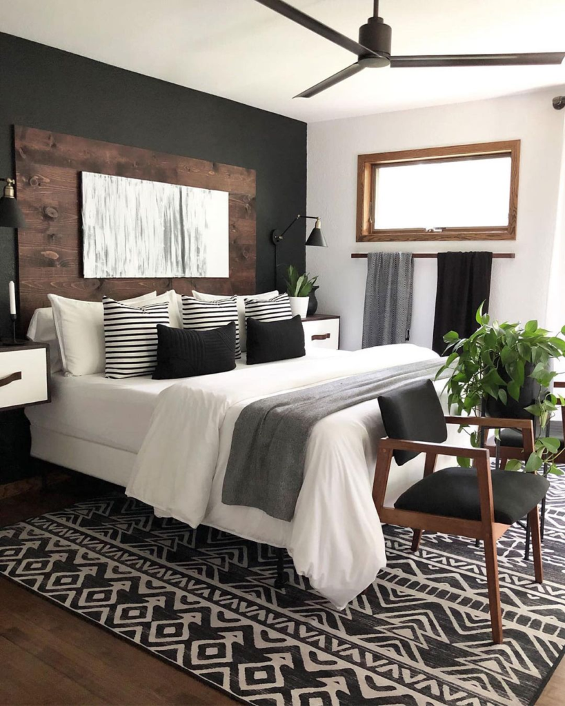 A rustic wooden headboard contrasts strikingly with a dark accent wall. Striped and solid pillows add a modern graphic touch, while a large abstract canvas enhances the wall’s artistic flair. The patterned area rug and mid-century chair combine traditional and contemporary styles, creating a stylish bedroom.