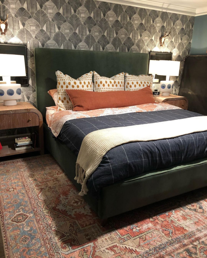 A deep green velvet headboard adds a luxurious touch against patterned wallpaper. Earth-toned linens and playful spotted pillows mix comfort with style. A traditional rug grounds the space with intricate patterns, while modern bedside lamps provide a contemporary twist to this eclectic bedroom.