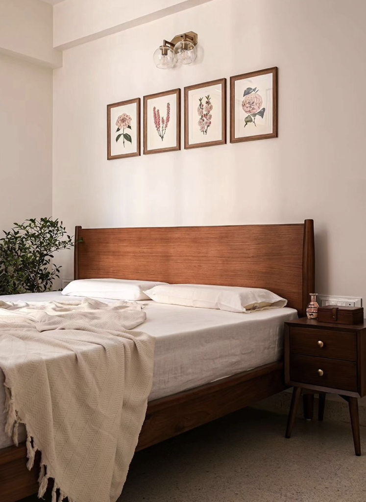 The bed features clean lines and natural wood, bringing warmth to a minimalist design. Above the bed, a trio of botanical prints adds a splash of color. Textured cream throws and soft linen bedding invite relaxation. A matching wooden nightstand and elegant light fixture complete this serene, plant-accented space.