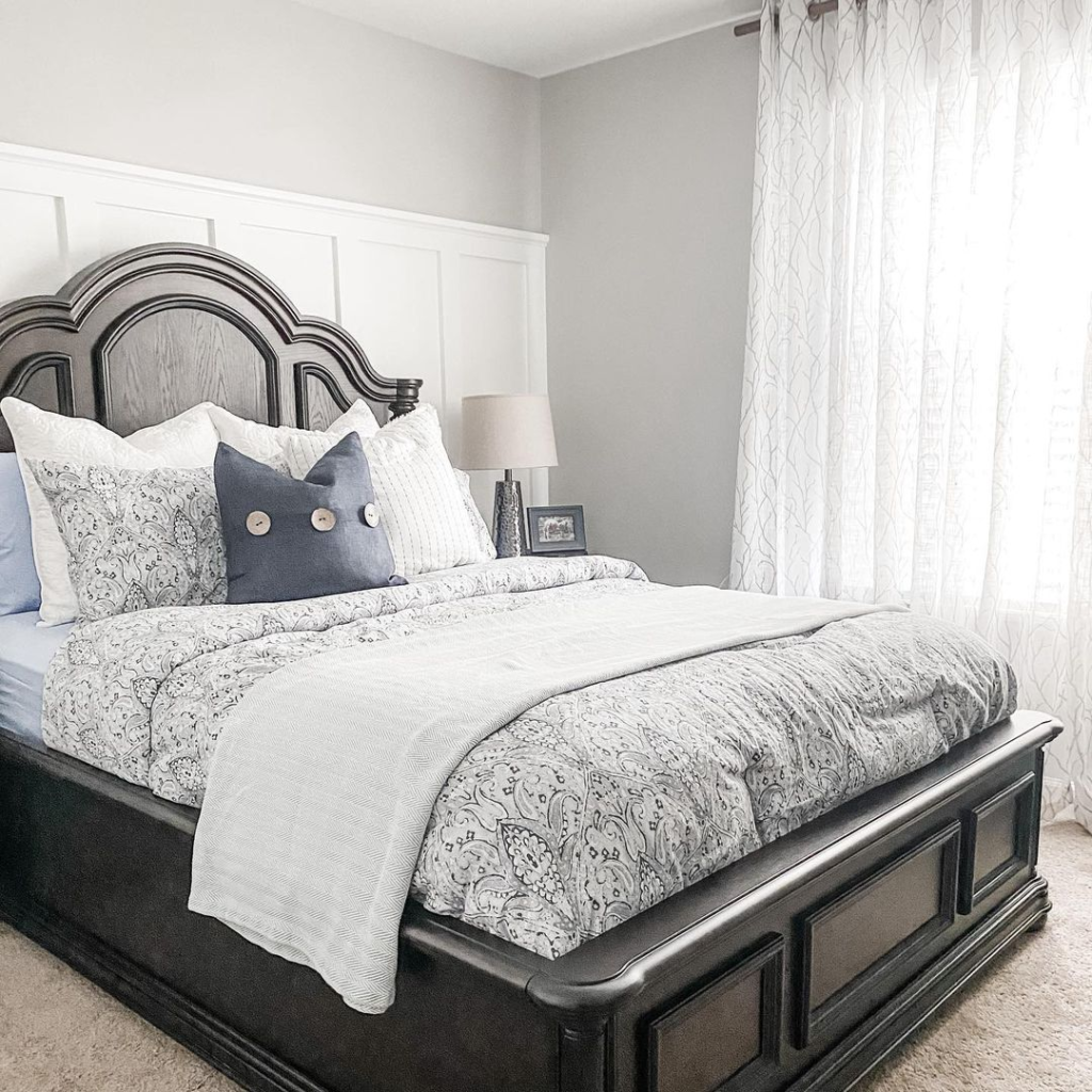 A stately dark wood bed frame contrasts beautifully with the light, airy room. Delicate patterns on the linens and solid navy accents create a balanced visual appeal. Gossamer curtains filter sunlight, enhancing the room’s serene atmosphere. The design strikes a harmonious balance between traditional elegance and modern simplicity.