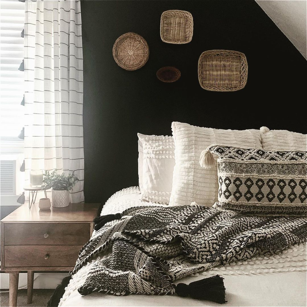 A bold black accent wall serves as a dramatic backdrop for textured white bedding. Woven basket wall art introduces a bohemian flair, contrasting with modern geometric patterns in the room. A knitted throw with tassels adds a mix of comfort and artisanal style. This design merges sleek modernism with rustic, handcrafted elements.