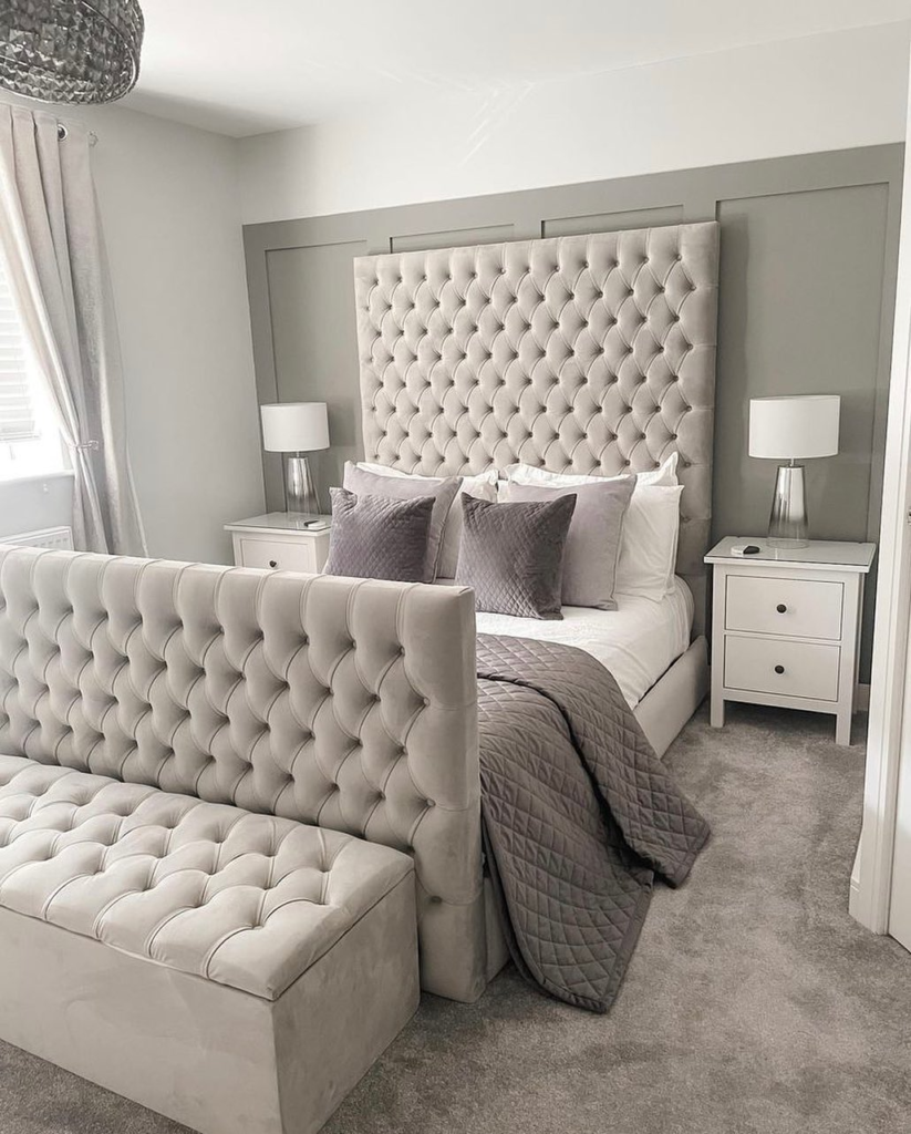 A grand tufted headboard in plush grey velvet commands attention, exuding opulence. Coordinating bedding and a matching bench continue the luxurious theme. Silver accents, including a chandelier and lamps, add a glamorous touch. The cohesive color palette creates a serene and sophisticated monochromatic bedroom.