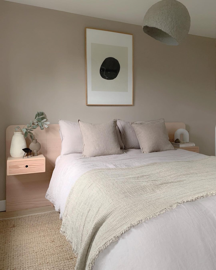 The neutral color palette evokes calmness, with blush tones and soft linens creating a peaceful escape. A minimalist art piece adds a modern, contemplative element. Floating wooden nightstands and a textured pendant light provide warmth without cluttering the space, showcasing the essence of minimalist design.