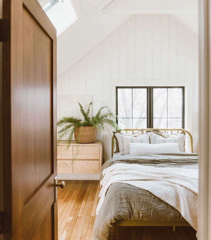 Vaulted ceilings and white paneling create an airy, open atmosphere, complemented by the tranquility of surrounding woods. A rattan bed frame and natural wood furniture add warmth and rustic charm. Earth-toned linens offer comfort, while a potted fern introduces a burst of natural life, harmonizing with the cabin-like feel.