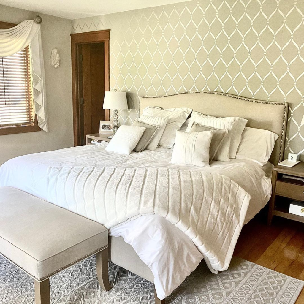An elegant headboard pairs with striking wallpaper to form a sophisticated focal point. Neutral bedding with rich textures provides a serene retreat. A bench at the foot of the bed echoes the headboard’s clean lines. Soft lighting and gentle drapery enhance the room’s inviting and tranquil atmosphere.