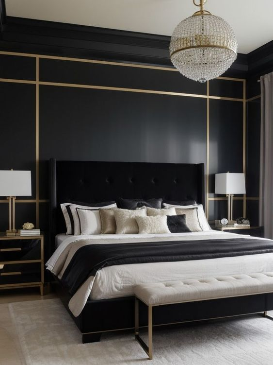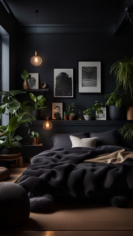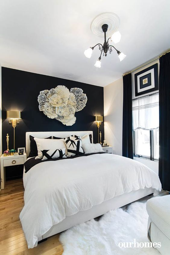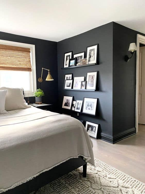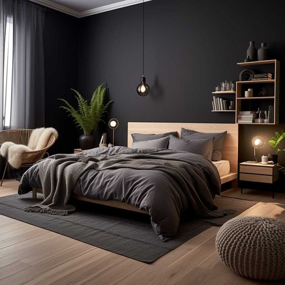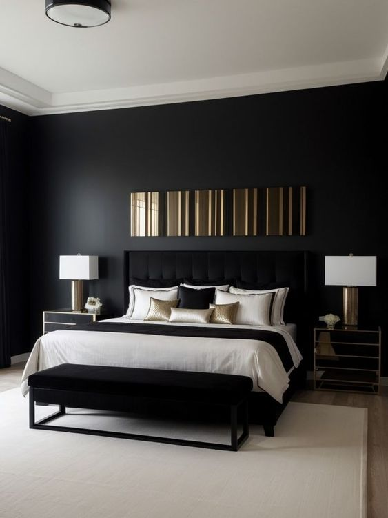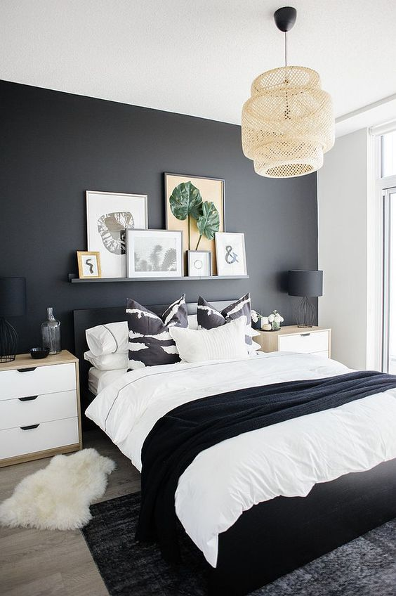 A black bedroom wall paired with white accents creates a striking and dynamic contrast. The black wall serves as a bold backdrop, while the white elements highlight and brighten the space. This classic color combination adds a sophisticated edge and helps maintain a clean and modern look.