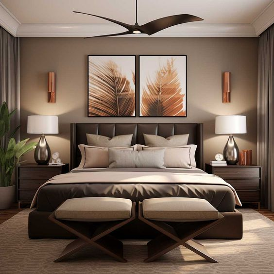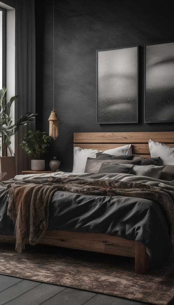 Neutral dark colors offer a refined and understated look for a bedroom. This color scheme provides a sophisticated backdrop that is easy on the eyes. Add natural elements, such as picture frames, to enhance the room’s aesthetic and maintain a calm and serene environment.
