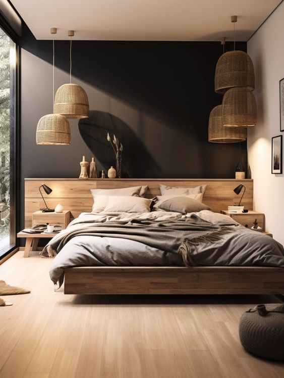 Matte black accent walls offer a sleek and sophisticated alternative to glossy finishes. The matte texture provides a subtle elegance and modern touch, enhancing the room’s visual appeal. This design choice creates a balanced and refined look, perfect for contemporary bedroom decor.