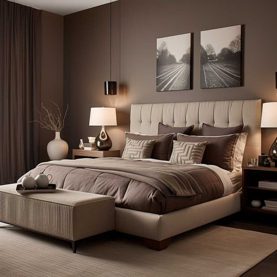 A dark brown accent wall offers a warm and cozy atmosphere, ideal for creating a comfortable and inviting bedroom. This color choice exudes a sense of richness and sophistication, making the room feel both stylish and snug. Pair the dark brown with complementary decor elements to enhance the room’s overall aesthetic.