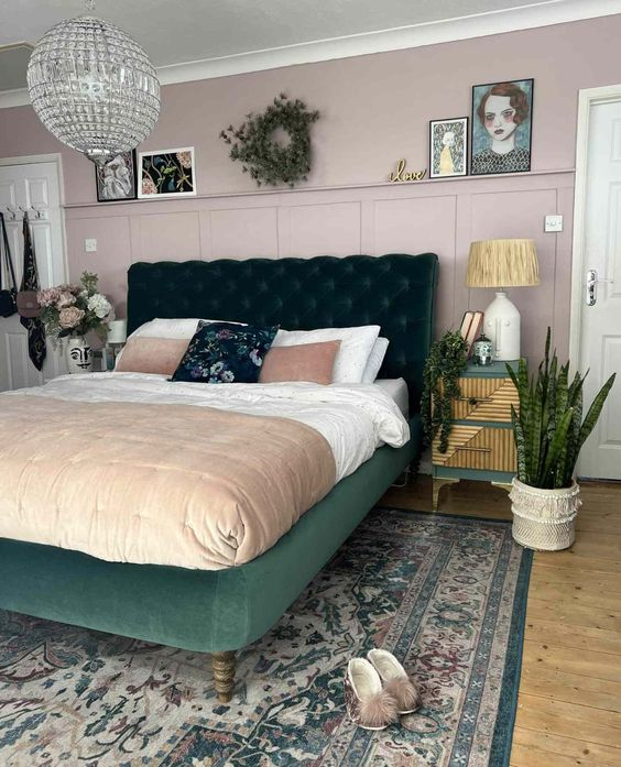 Combine dark green with wooden accents for a harmonious and earthy bedroom design. Dark green evokes a sense of tranquility, while wooden elements add natural warmth and texture. This combination creates a charming and inviting space that feels both grounded and stylish.