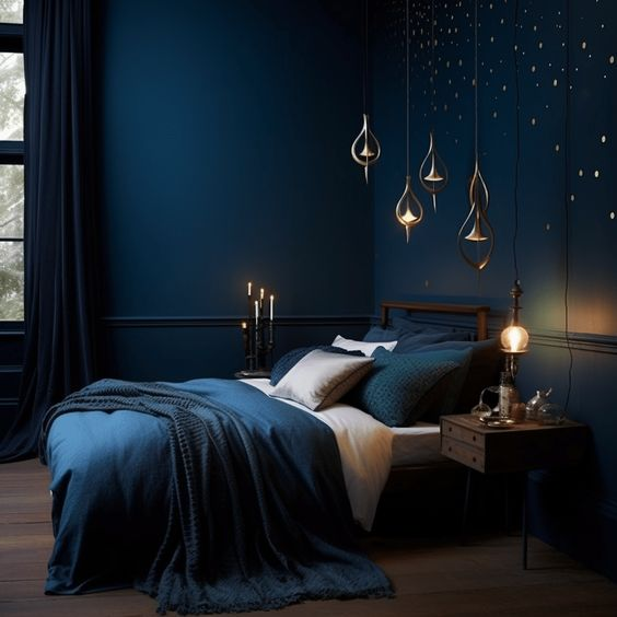 A navy blue accent wall can infuse your bedroom with a sense of sophistication and warmth. This regal color creates a calming and immersive environment, perfect for a serene retreat. Complement the dark blue with lighter touches, such as gold accents, to balance the room’s overall aesthetic and enhance its elegance.