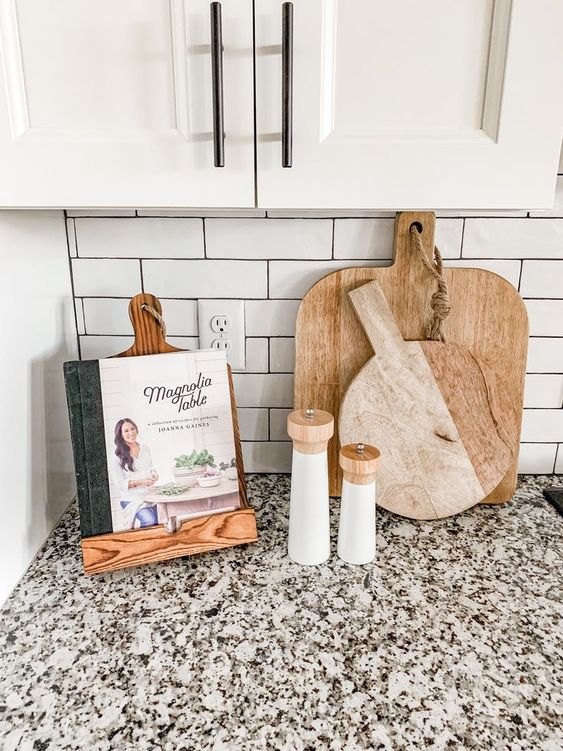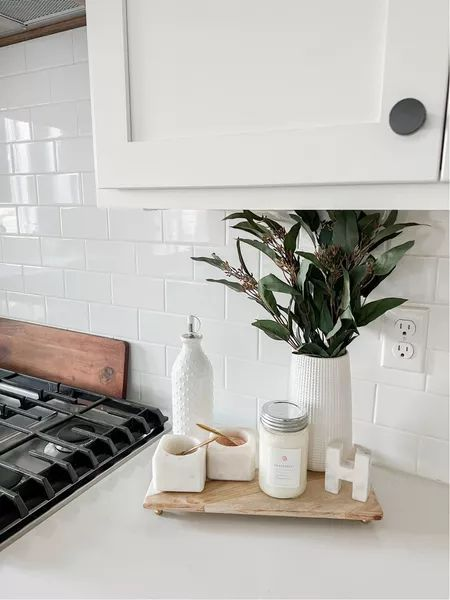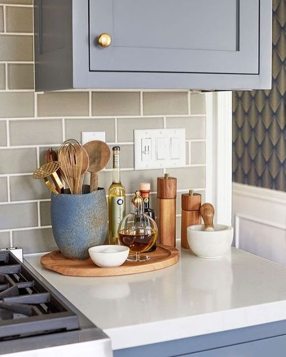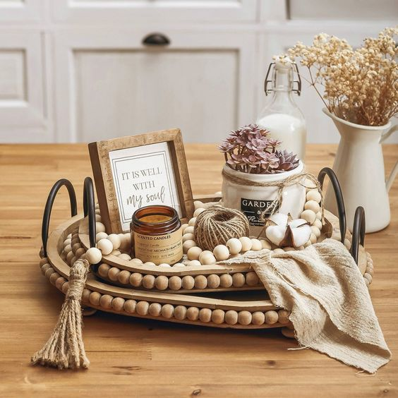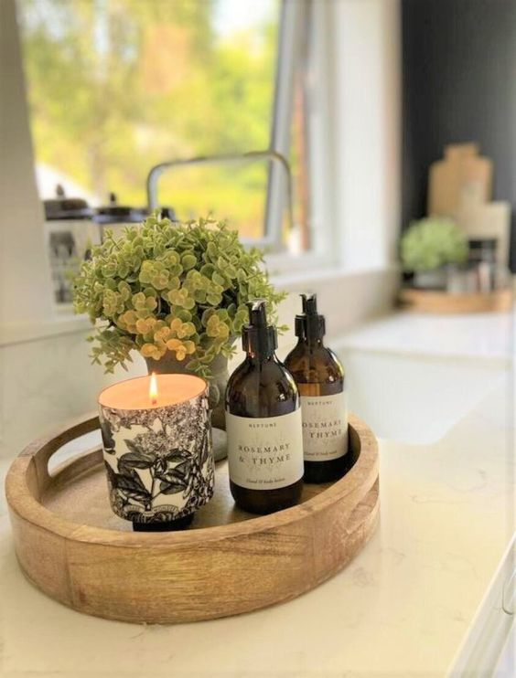 A wooden tray serves as an excellent starting point for your kitchen counter decor, thanks to its versatility and appeal. Its natural warmth and charm create an inviting atmosphere, enhancing the overall aesthetic of your kitchen.