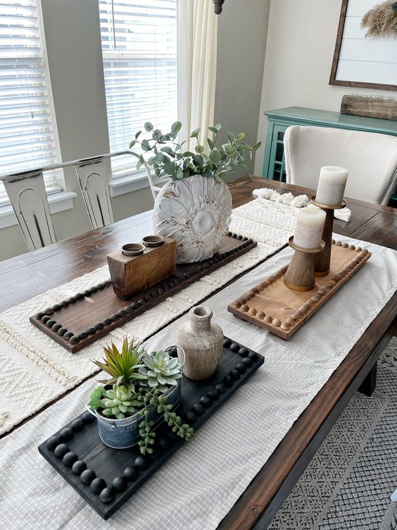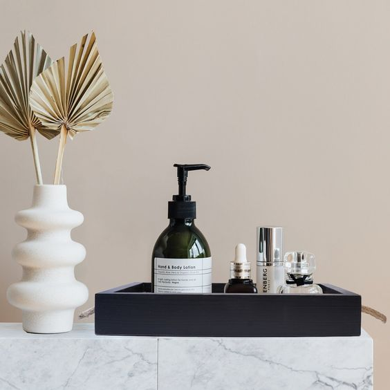 Combining a black tray with greenery offers a sleek and refreshing contrast. The dark tray provides a modern, elegant backdrop for vibrant green plants or faux stems, resulting in a stylish and eye-catching arrangement.