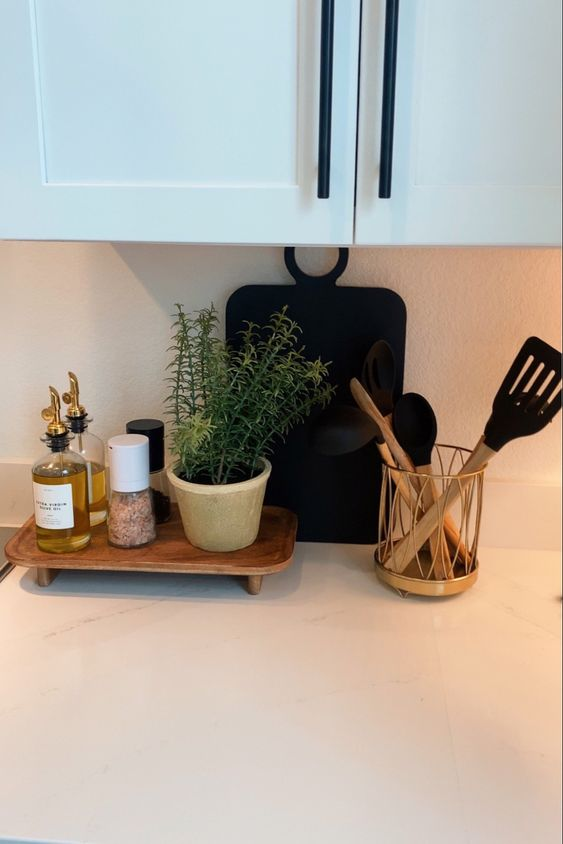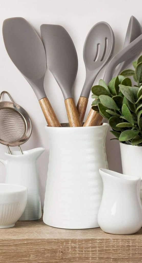 Combine white utensils with a wooden tray for a harmonious and stylish arrangement. The contrast between the bright utensils and the natural wood creates a balanced and inviting aesthetic, perfect for enhancing your kitchen’s charm.