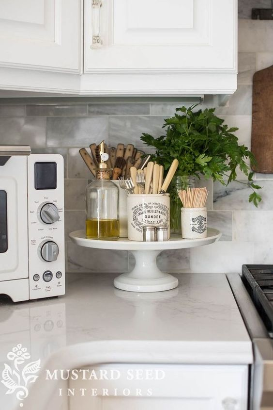A cake stand can be a striking decorative piece on your countertop. Pair it with candles to add a touch of warmth and elegance to your kitchen. This setup not only looks beautiful but also creates a cozy, inviting atmosphere.