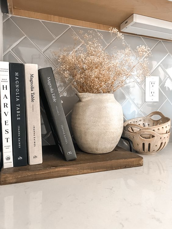 Enhance your kitchen counter with greenery and books arranged on a tray. This setup combines fresh plant life with the classic charm of books, creating a visually appealing and personalized touch that completes the look of your kitchen decor.