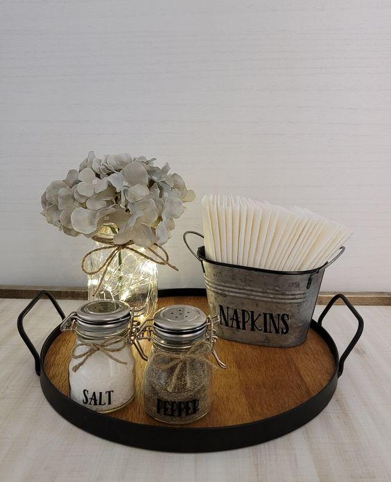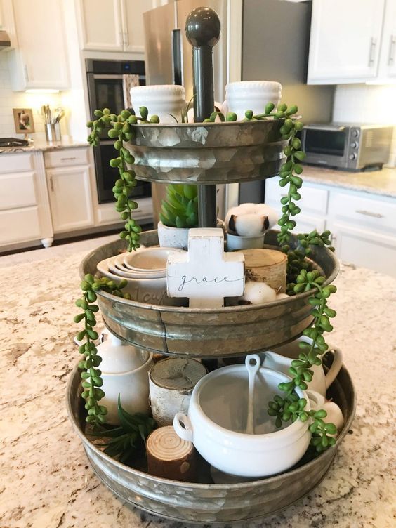 A two-tier tray offers a stylish way to showcase items and set a theme in your kitchen. Whether you’re going for a seasonal look or a specific design, this tray allows you to display various elements, creating a visually appealing and organized arrangement.