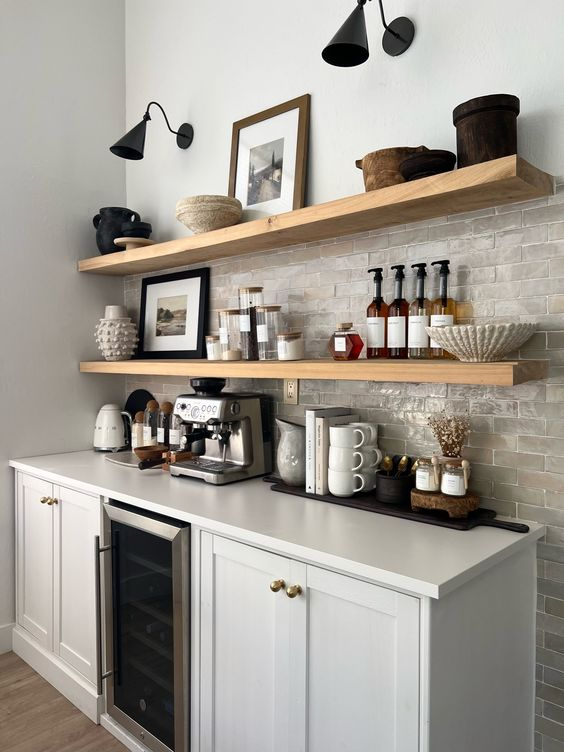 Create a charming coffee nook in your kitchen to showcase your love for coffee. Designate a corner for a coffee machine and coffee mugs, turning it into a cozy and functional space dedicated to your favorite brews.