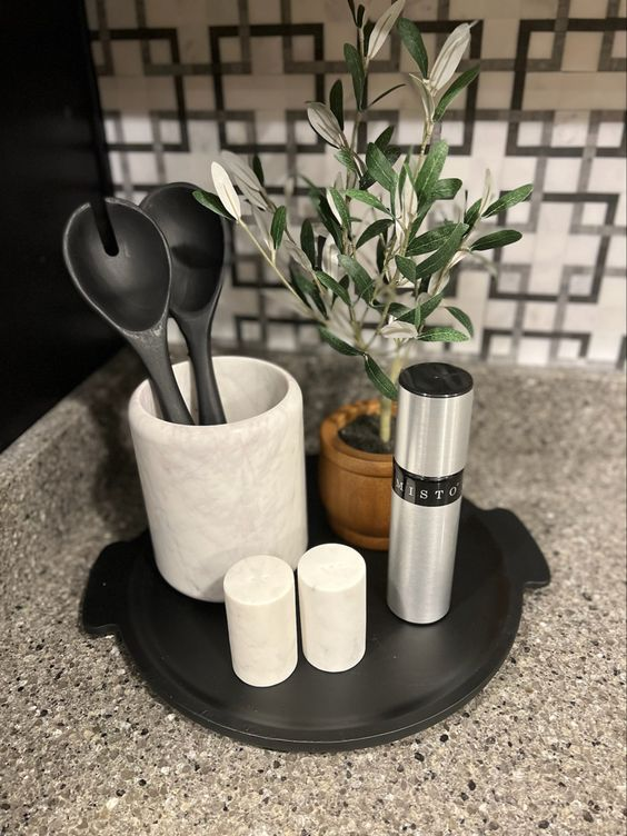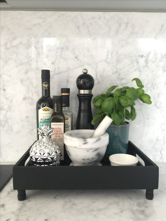 A black tray paired with greenery provides a sleek and refreshing look. The contrast between the dark tray and vibrant green plants creates a modern and elegant arrangement that enhances the visual appeal of your kitchen.