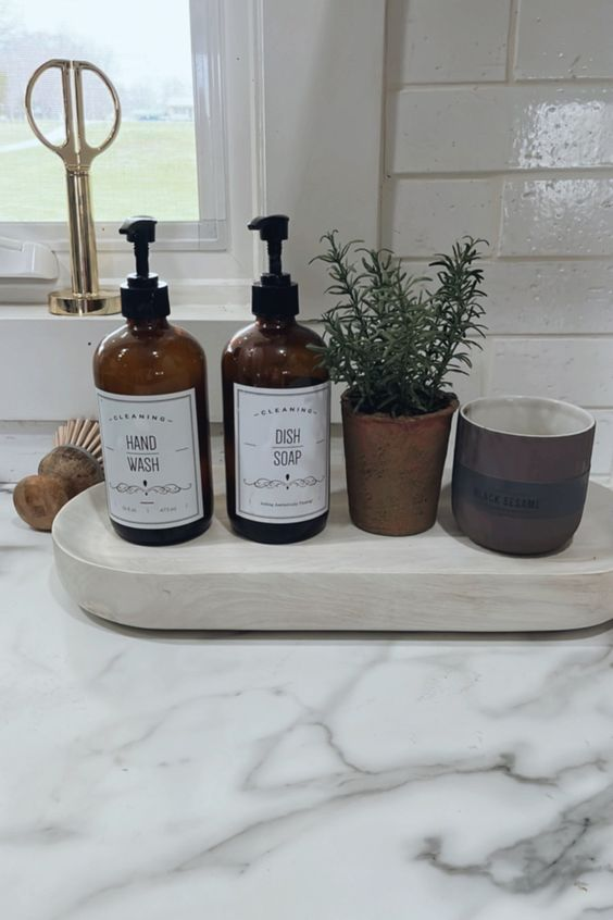 If you’re looking to organize your condiments, a wooden tray paired with dispensers is a practical and stylish solution. Instead of storing condiments in the pantry, place them in dispensers on the tray for easy access and a neat appearance.