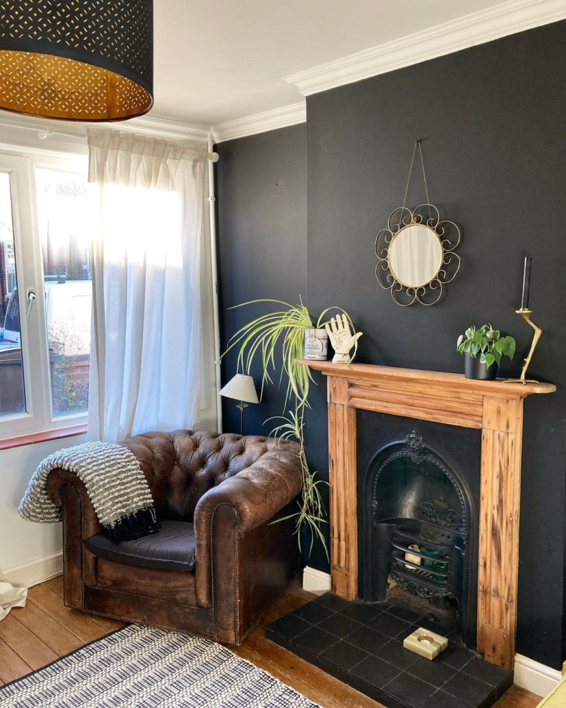 Dark walls create a moody, historical atmosphere in this living room. Contrasting textures, such as the sleek fireplace and soft upholstery, add depth and intrigue. Natural light from tall windows breathes life into the space, while wood elements and greenery infuse a bohemian essence.