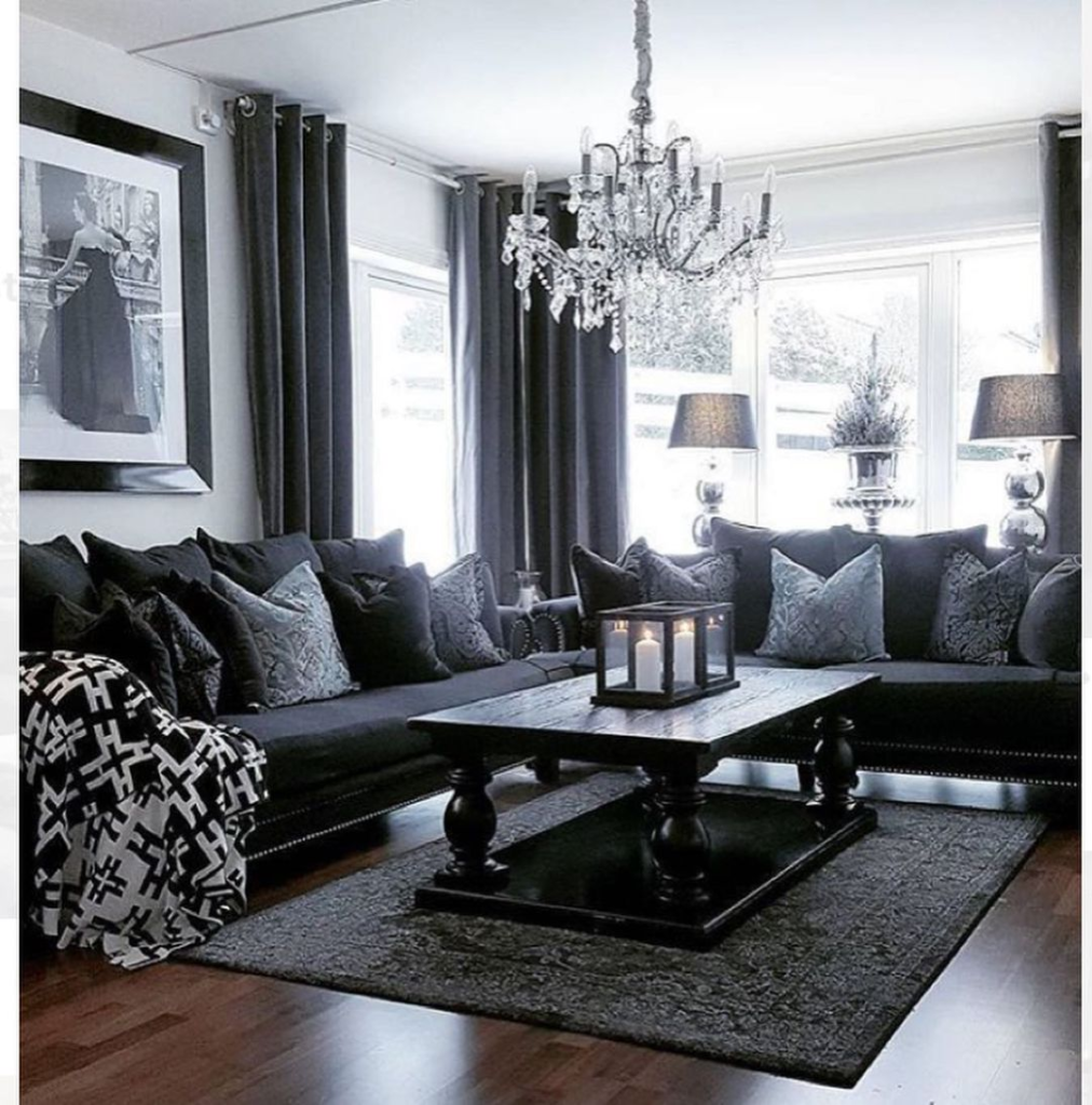 Luxurious black drapes frame the room, adding depth and a sense of opulence. A grand chandelier serves as a glamorous centerpiece. Cozy textiles and plush cushions enhance comfort, while a sleek black coffee table provides a modern anchor. Subtle silver accents and intricate textures elevate the monochromatic palette with a touch of elegance.