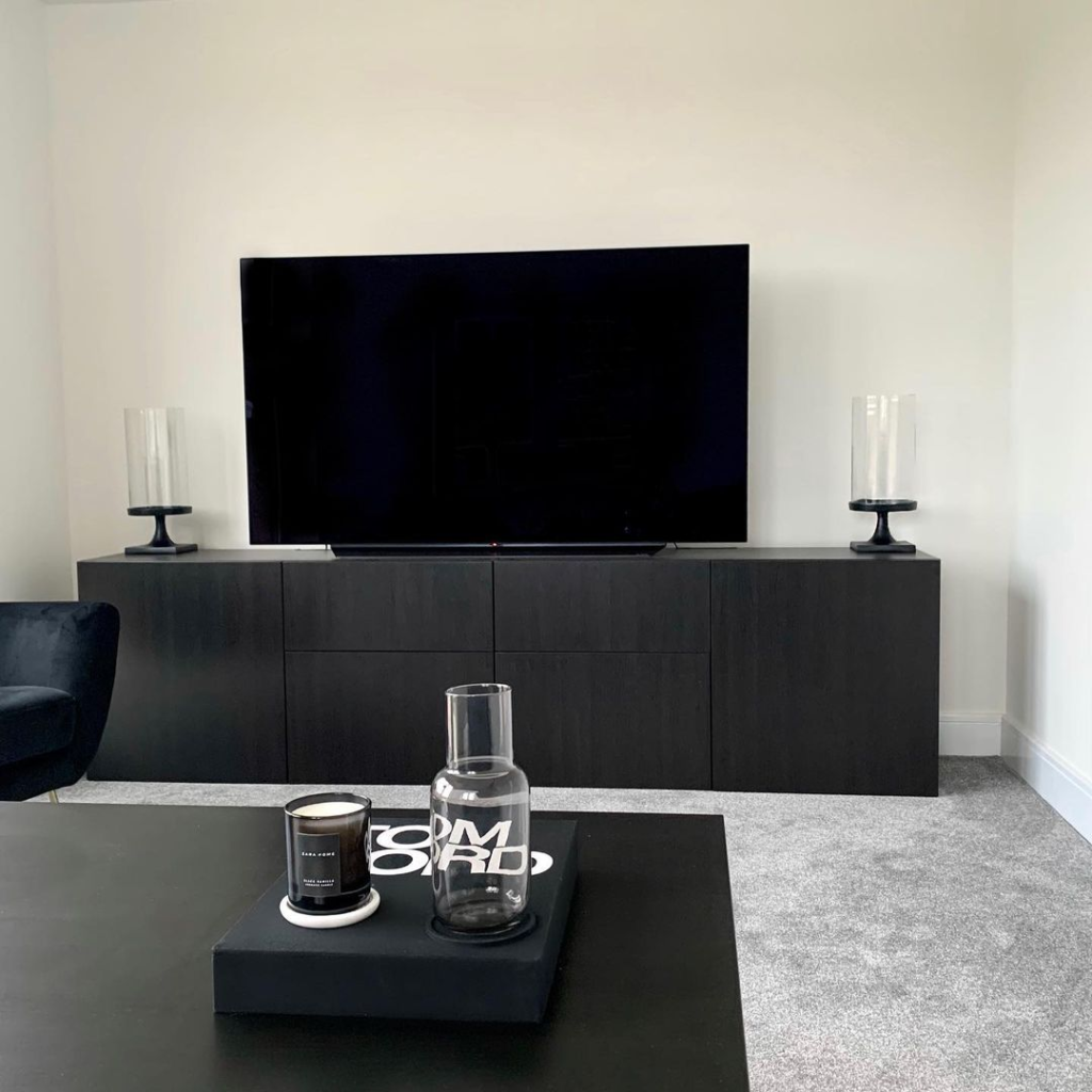 A minimalist black media unit contrasts cleanly with light walls, emphasizing simplicity. The large screen is flanked by understated candlesticks, while a monochromatic centerpiece maintains the sleek look. This setup showcases a blend of functionality and elegance with a refined touch.