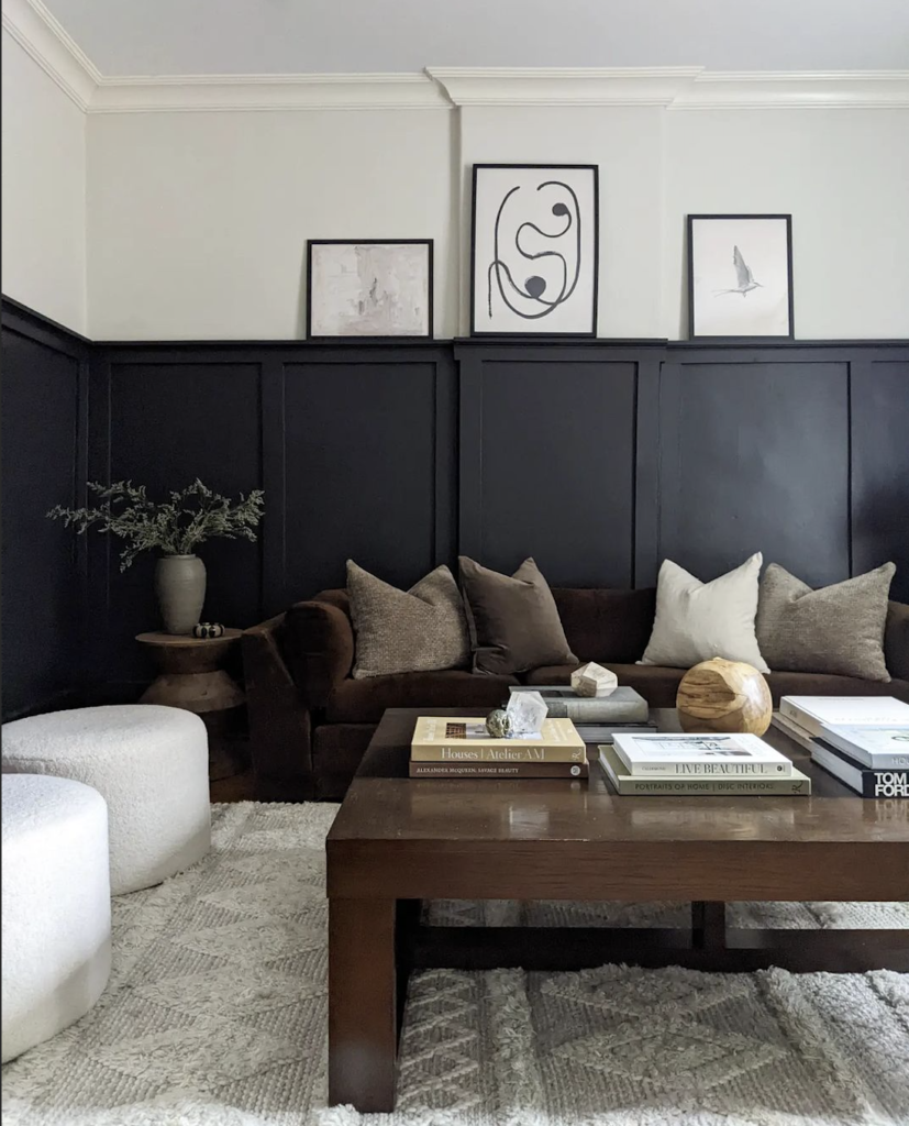Dark wainscoting adds depth and frames the room beautifully, drawing the eye upward. Above, captivating artwork contrasts artistically with the darker tones. A richly textured sofa adorned with earth-toned pillows invites relaxation, while a clean-lined wooden coffee table grounds the room’s aesthetic.