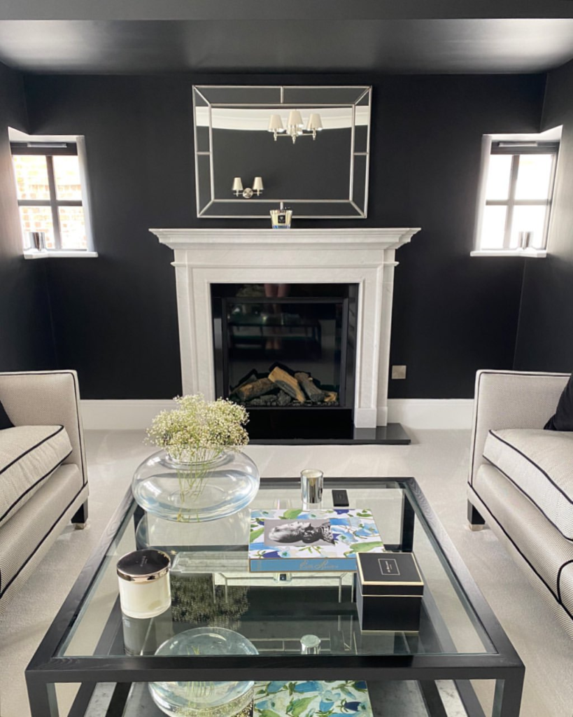 Black walls offer a dramatic setting for an elegant white fireplace. Sleek, tailored furniture provides a modern counterpoint, while a glass coffee table and mirror reflect light and brighten the room. Delicate accessories and floral arrangements add a chic, softening touch to the bold color scheme.