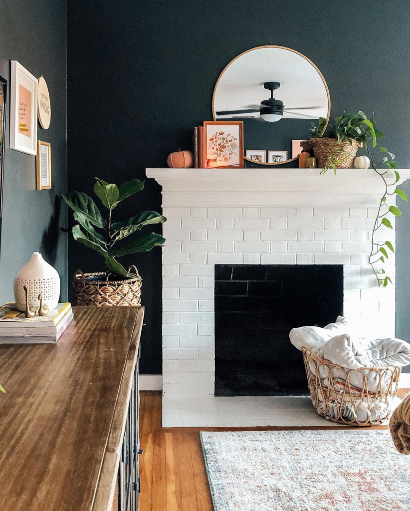 The matte black wall creates a dramatic backdrop for a white fireplace and mirror, offering a striking contrast. Warm wood tones and woven textures introduce a bohemian flair. Lush greenery breathes life into the dark palette, softening its intensity and adding an eclectic touch.