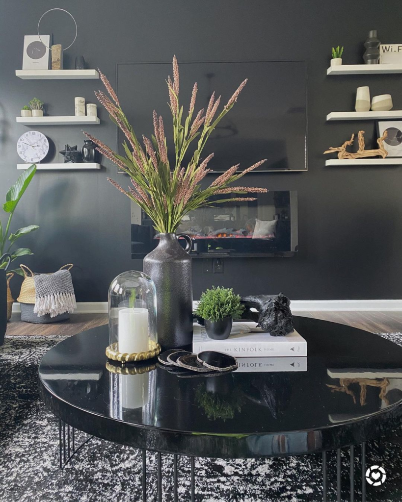 Sleek shelves against a black wall showcase a gallery of modern minimalism. The glossy black round table reflects the serene ambiance, while botanical elements and a woven pillow add organic warmth. This setting nods to nature’s tranquility amidst urban sophistication.