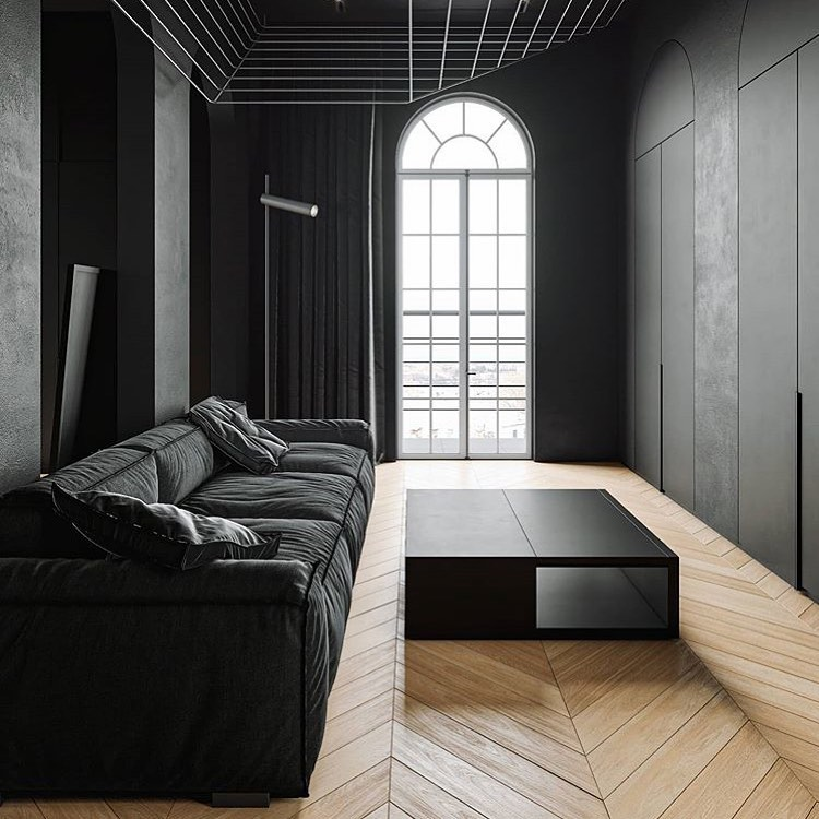 The stark geometry of the room’s architecture contrasts with plush sofa textures and drapery. An arched window allows natural light to illuminate the dark walls, creating striking contrasts. Herringbone wood flooring adds warmth, while minimalist furniture complements the room’s modern, sculptural aesthetic.