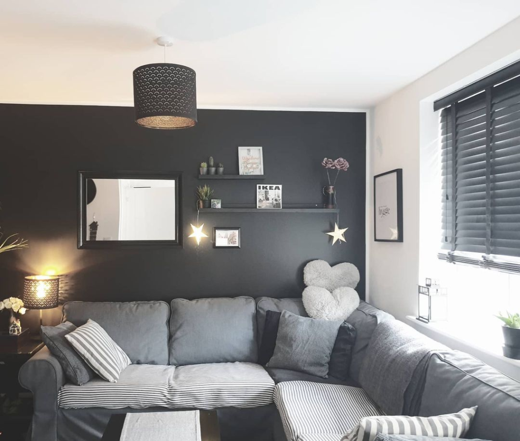 Charcoal walls provide a cozy backdrop for personal mementos and wall art. Decorative lamps cast a warm glow, enhancing the inviting atmosphere. Striped and textured cushions on the sofa add comfort and visual depth. Playful star-shaped lights introduce a whimsical charm, making the room both inviting and homely.