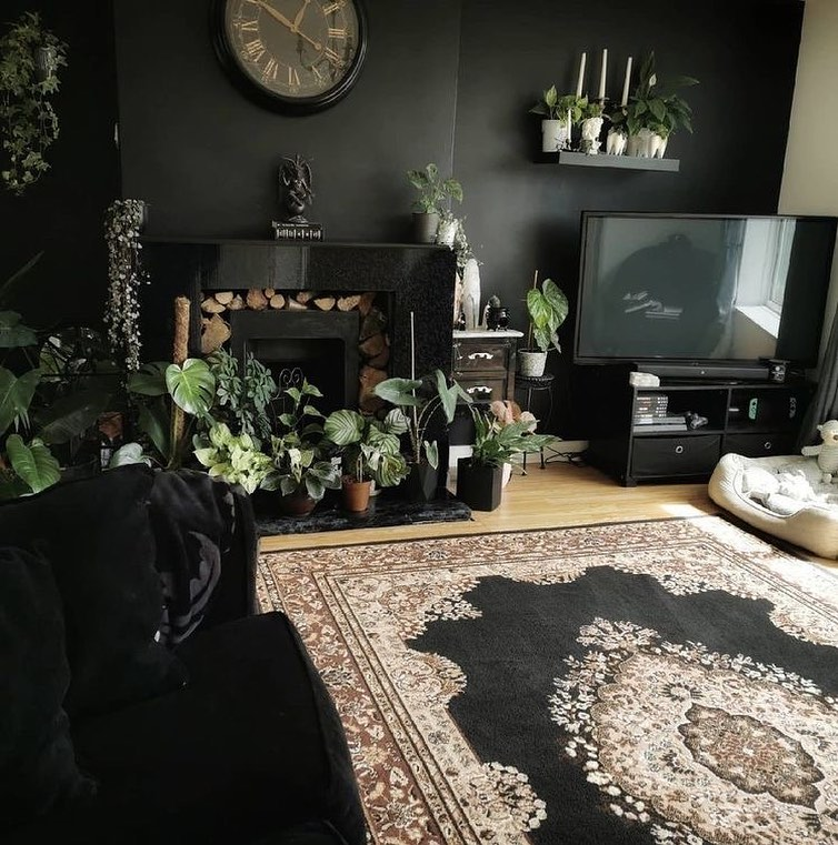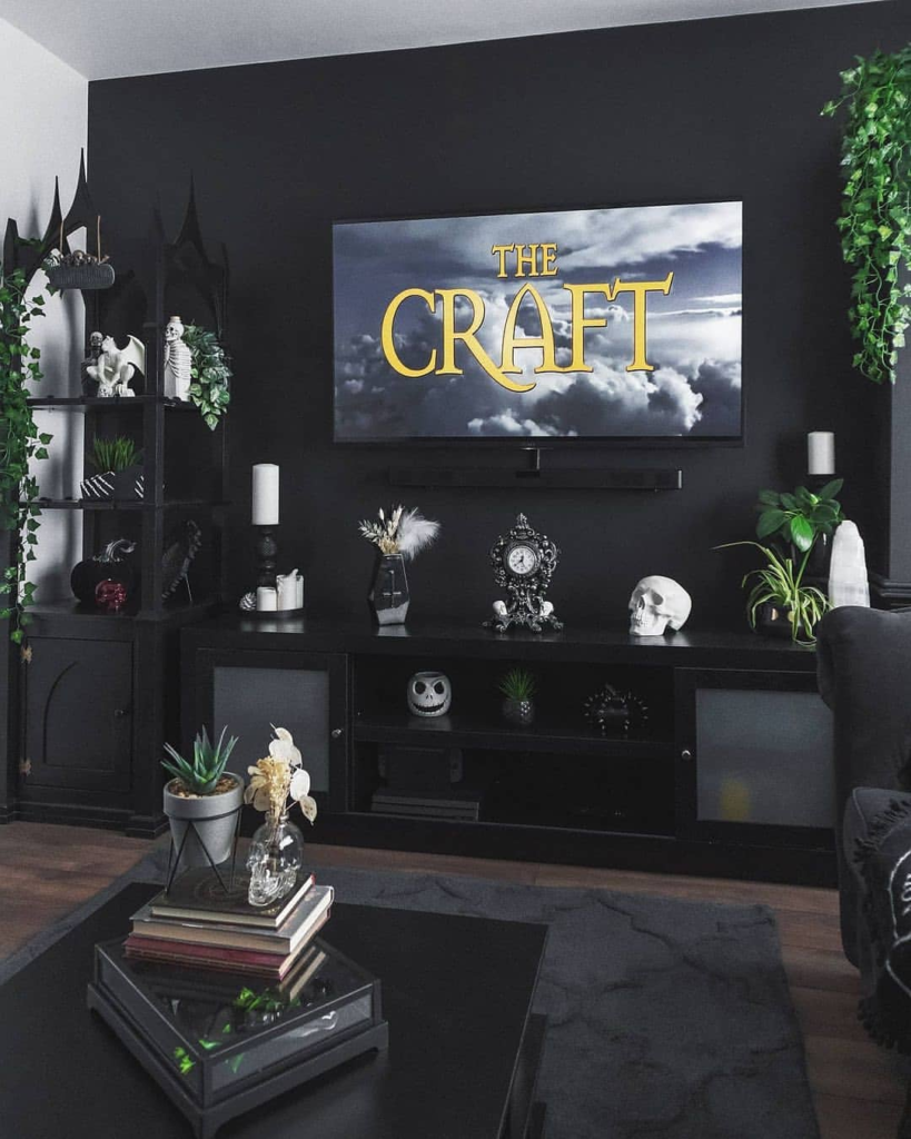 This room channels a gothic chic vibe with dark walls and eclectic decor. Shelving adorned with themed ornaments and plants adds unique personality. Plush black furnishings offer both comfort and style, while cascading greenery introduces a fresh, botanical twist to the mysterious aesthetic.