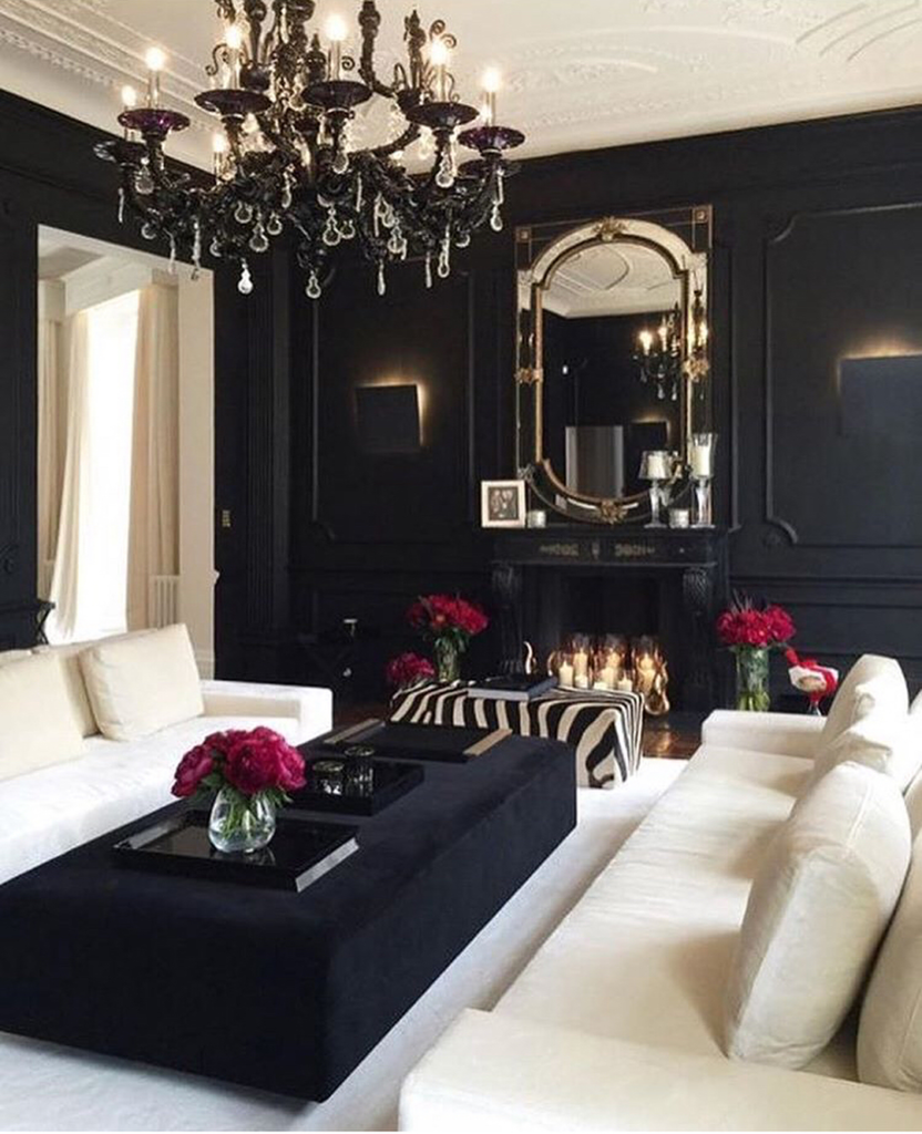 A bold black feature wall makes a statement, enhanced by the room’s natural light. White sofas and chic cushions provide a soft, inviting contrast. An elegant chandelier and mirrored decor contribute to the room’s grandeur, blending gothic elements with modern comfort.