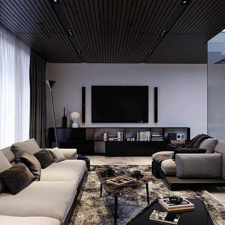 A sleek black media wall anchors the room with modern minimalism. Plush sofas in muted tones invite relaxation, while a wooden slatted ceiling adds warm textural contrast. A shaggy rug and soft draperies enhance the cozy, tactile experience within the cool, dark tones.