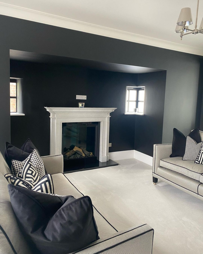 Black walls provide a bold backdrop for a classic white fireplace. Geometric patterns on the cushions introduce visual interest, complementing the sleek design. A subtle mix of textures enriches the monochrome theme, while natural light softens the contrasts and brightens the space.