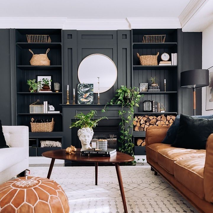 Black built-in shelves contrast strikingly with warm leather seating in this eclectic space. The shelves are styled with diverse textures and natural elements. Greenery adds a lively pop of color against the dark backdrop, while a round mirror and unique decorative pieces reflect a curated, eclectic vibe.