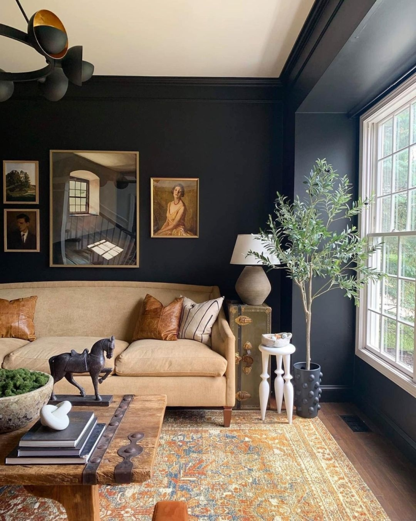 Deep black walls set a dramatic stage for vintage portraits and rustic wood furniture. A tan sofa and ornate rug bring warmth and balance to the dark tones. Sculptural lighting and greenery add a contemporary twist, while natural light ensures the room feels inviting and lived-in.