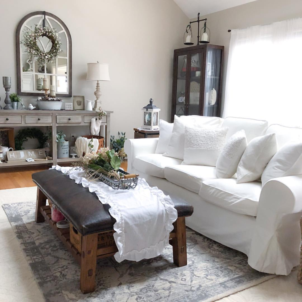 The pristine white couch acts as a modern contrast to the rustic wooden bench, anchoring the room with a fresh look. Soft white cushions provide added comfort and enhance the tranquil ambiance. Accent pieces like the lantern and the charming ‘HOME’ sign infuse the space with personal touches. Natural light streaming through the window further highlights the inviting appeal of the couch.