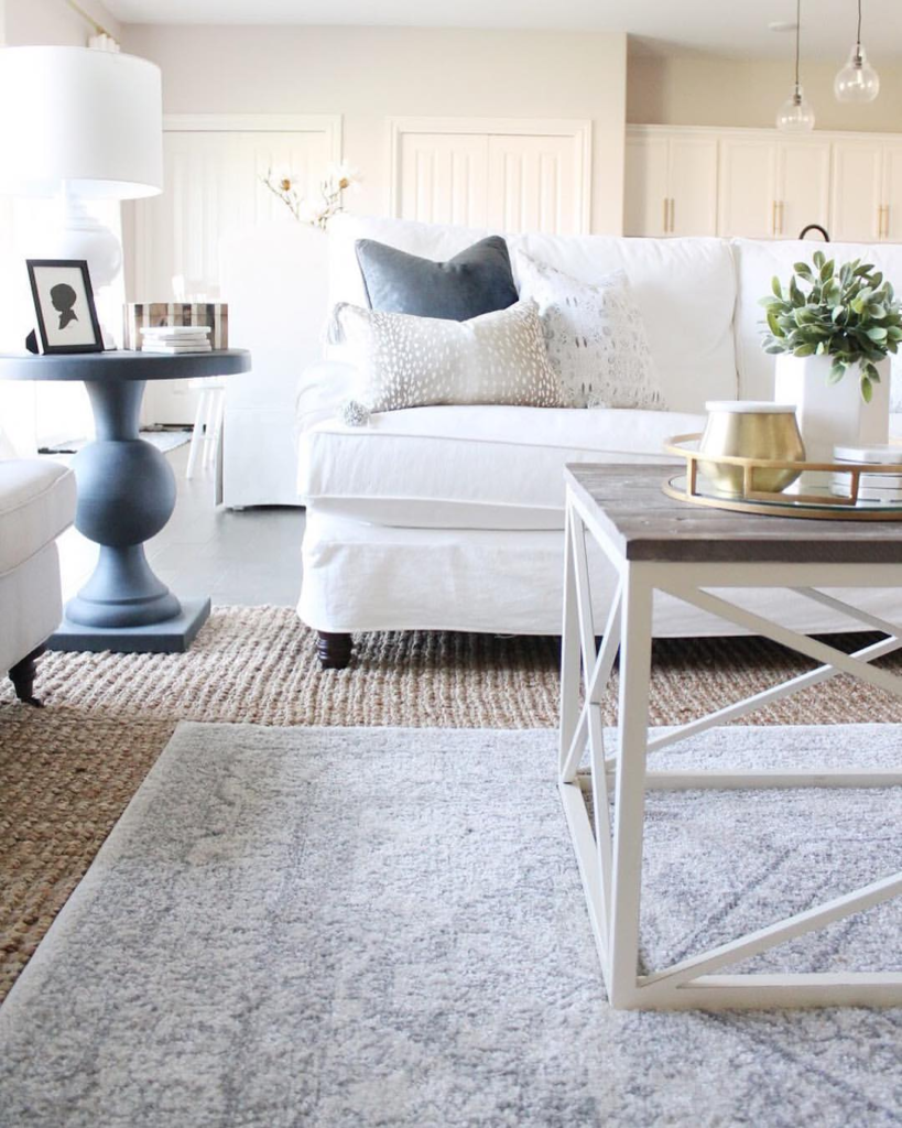 The white couch stands out against the muted room tones, creating a minimalist yet striking effect. Dark blue and patterned cushions introduce vibrant color and texture, while the modern white and wood coffee table complements the overall design. Layered rugs help define the space, and the silhouette portrait alongside the plant adds a personal, lively touch.