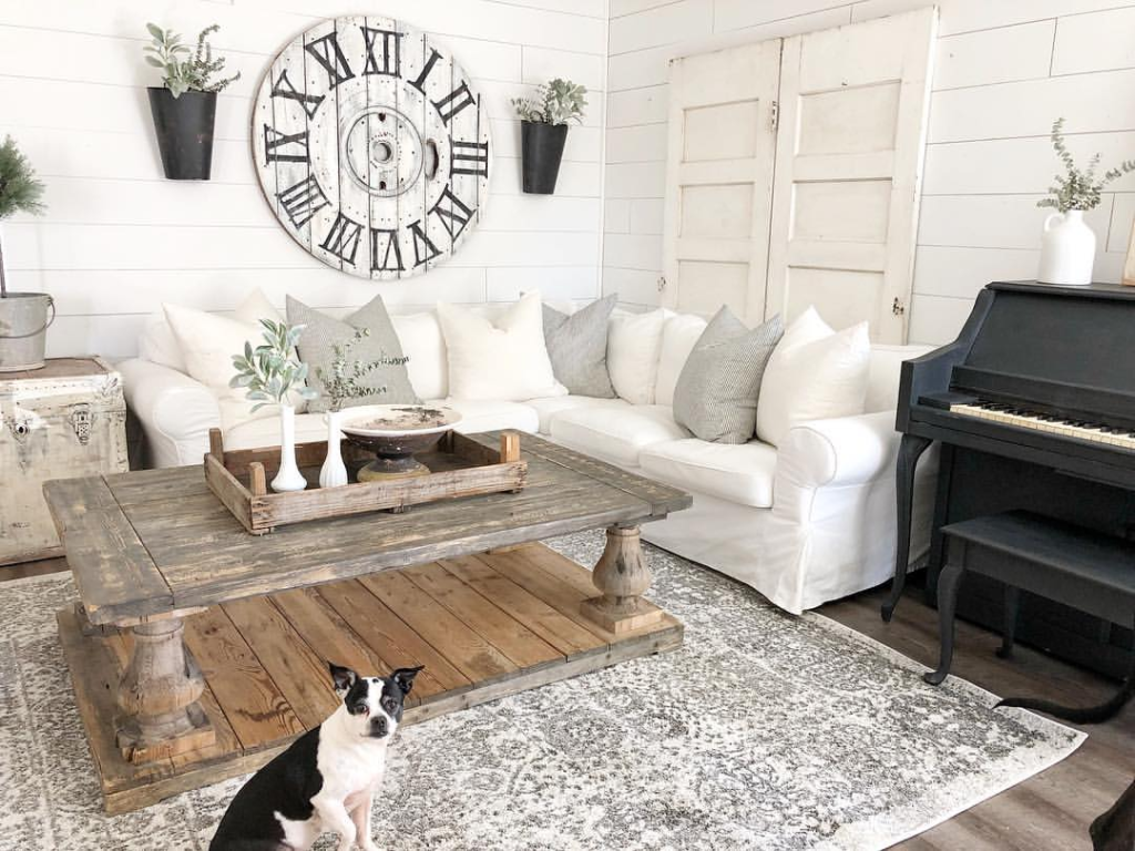 The white couch becomes a focal point in the room’s farmhouse-inspired decor. A large wall clock offers a touch of vintage charm, while rustic wooden accents, such as the coffee table, balance the room’s white elements. Greenery and a piano add a cultivated, homely feel, completing the classic farmhouse look.