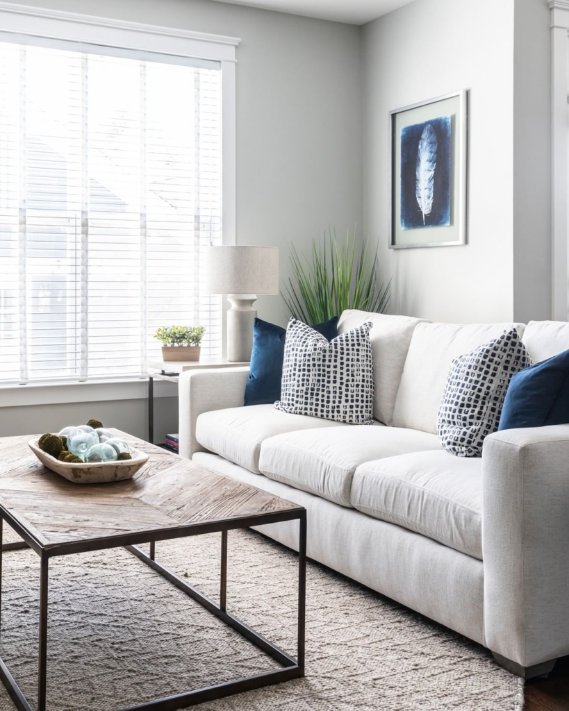 The white couch serves as a stylish backdrop for a mix of geometric and solid navy pillows. A rustic wooden coffee table provides contrast to the couch’s sleek lines. Lush greenery introduces a natural element, complementing serene artwork. The soft, textured rug and modern lamp contribute to the sophisticated ambiance.