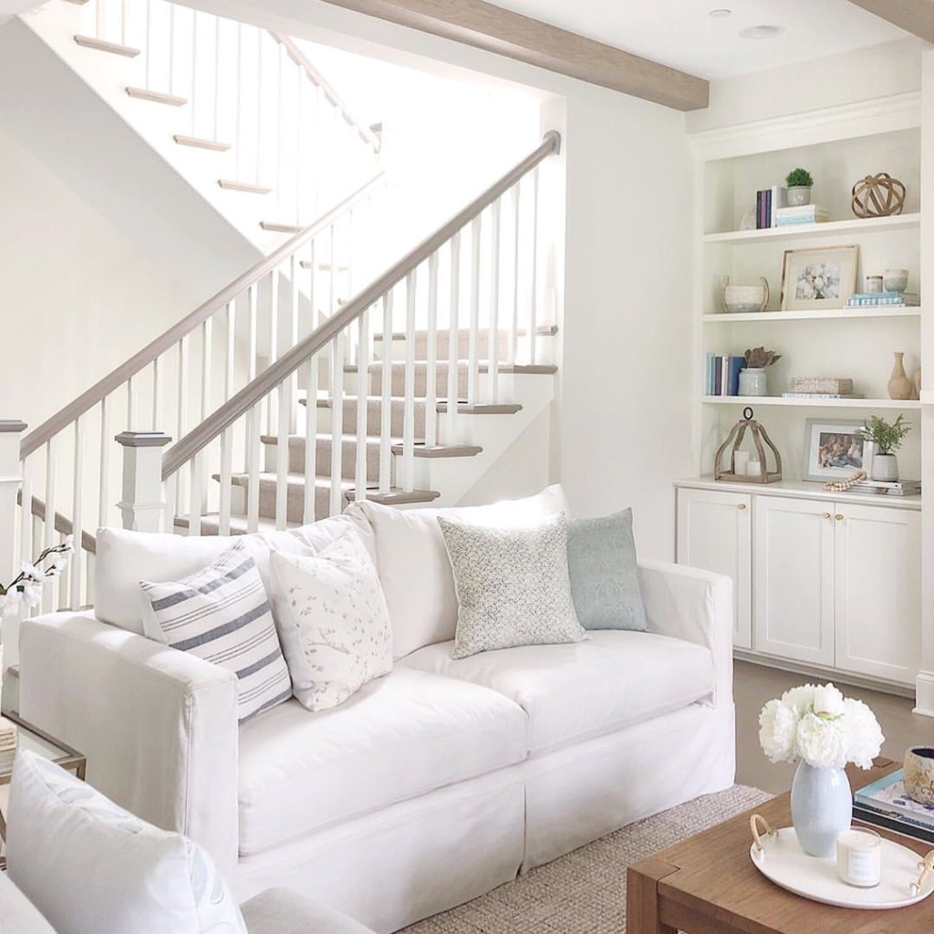 The white couch is perfectly situated in a bright corner, offering a cozy retreat. Cushions with soft patterns and stripes add subtle visual interest. Built-in shelves display curated decorative items, blending functionality with style. The staircase overhead adds architectural charm, enhancing the room’s overall design.